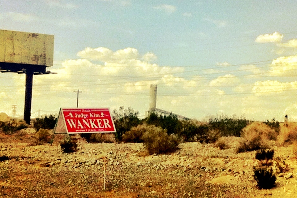 En route through the Mohave desert there were some interesting signs, as always on US roads. A local judge clearly wishes to be re-elected, as you can see from this real roadside ad. Who dares now disagree with the proposition that some judges are wankers?